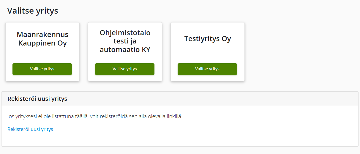 Olemassa olevat yritykset: Jokainen yritys näkyy omana korttinaan (esim. "Maanrakennus Kauppinen1 Oy").