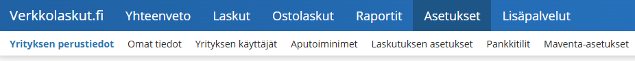 - Yrityksen perustiedot- sivulla saat asetettua yrityksesi yhteystiedot, jotka tulevat näkyviin tekemillesi laskuille. Laskutustiedot-kohdassa voit määritellä ne osoitetiedot, johon haluat vastaanottaa meiltä Verkkolaskut.fi:n käytöstä muodostuvan laskun.