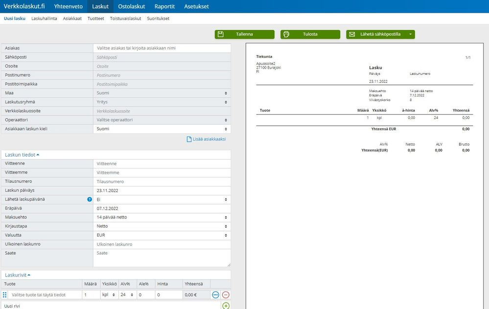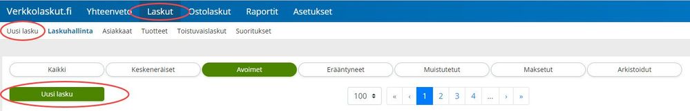 Saat luotua laskun kohdasta Laskut -> Uusi lasku.