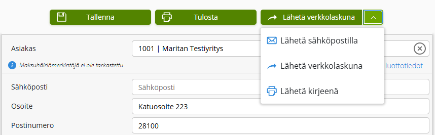 Tärkeä huomio: Älä valitse "Posti" -lähetystapaa, jos aiot toimittaa laskun itse. Muutoin lasku lähtee turhaan myös Postin jakeluun ja siitä veloitetaan.