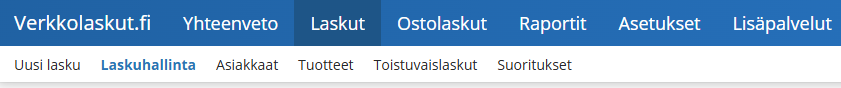 Sivulle pääset klikkaamalla ohjelman yläosasta Laskut, ja edelleen tarvittaessa Laskuhallinta. Tämä on ensimmäisenä aukeava sivu kun klikkaa ylävalikon Laskut -painiketta, eli alavalikon klikkausta ei välttämättä erikseen tarvita.