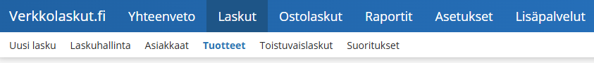 Sivulle pääset klikkaamalla ohjelman yläosasta Laskut ja edelleen Tuotteet.