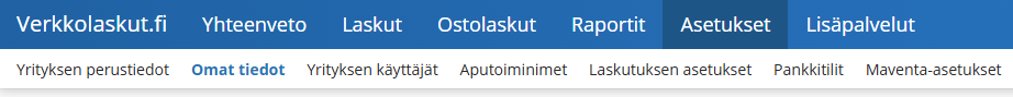 Sivulle pääset klikkaamalla ohjelman yläosasta Asetukset ja edelleen Omat tiedot.