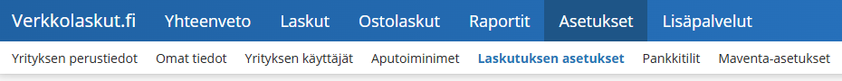 Sivulle pääset klikkaamalla ohjelman yläosasta Asetukset ja edelleen Laskutuksen asetukset.