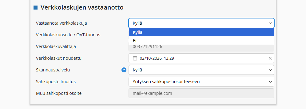 Muuta Vastaanota verkkolaskuja -valinta tilaan Ei.