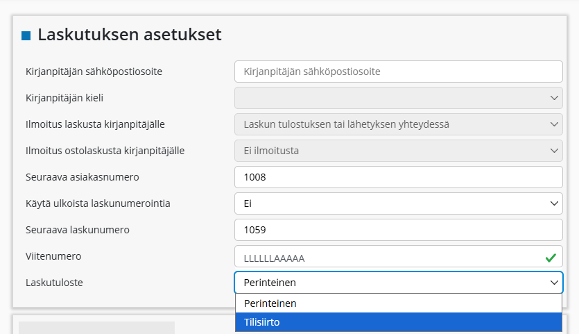 Saat lisättyä laskulle viivakoodin ja QR-koodin vaihtamalla laskutulosteen muodoksi Tilisiirto kohdassa Asetukset -> Laskutuksen asetukset. Valittavissa on kaksi eri pohjaa: Perinteinen, joka on ilmeeltään pelkistetty, sekä Tilisiirto, johon ohjelma muodostaa automaattisesti viivakoodin ja QR-koodin helpottamaan asiakkaan maksamista.