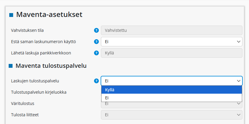 Voit ulkoistaa myyntilaskujesi tulostuksen ja postituksen kytkemällä Maventa-tulostuspalvelun päälle kohdassa Asetukset -> Maventa-asetukset.
