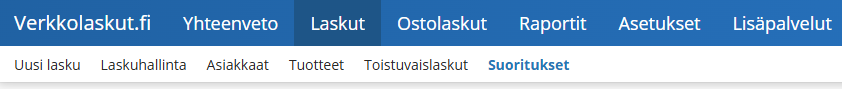 Suoritukset-sivulle pääset klikkaamalla ohjelman yläosasta Laskut, ja edelleen Suoritukset.