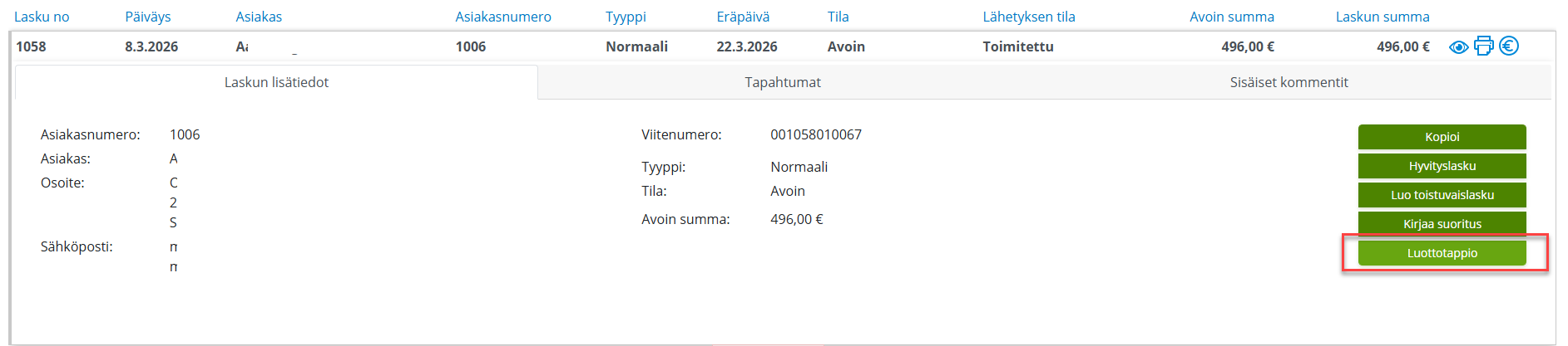 Jos uskot, että asiakas ei tule maksamaan laskua toistuvista muistutuksista ja perinnästä huolimatta, voit kirjata laskun luottotappioksi. Tämä toiminto poistaa laskun avoimista saatavista ja siirtää sen kirjanpidollisesti oikaisuksi.