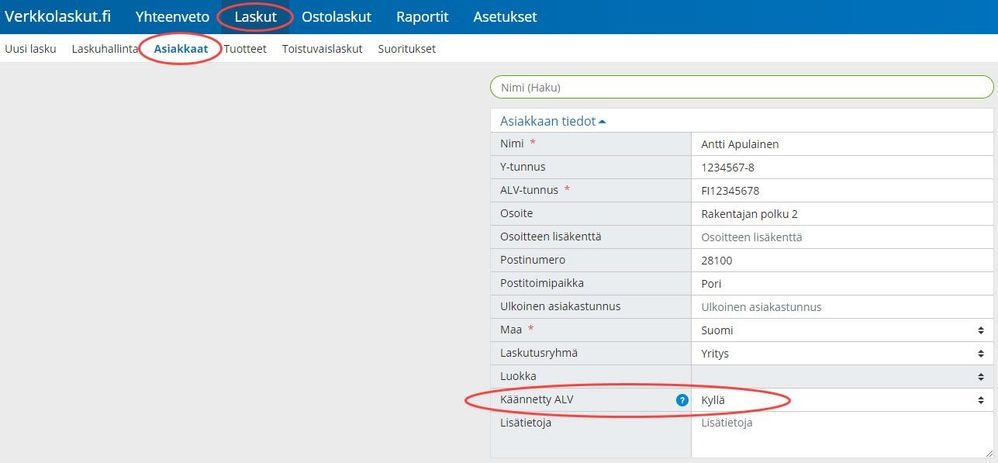 - Etsi asiakkaan tiedoista kohta Käännetty ALV ja valitse pudotusvalikosta Kyllä.