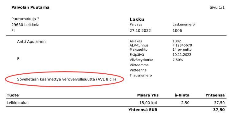 - Laskumerkintä: Ohjelma lisää laskulle automaattisesti lakisääteisen merkinnän käänteisestä verovelvollisuudesta (Rakentamispalvelujen myynti).
