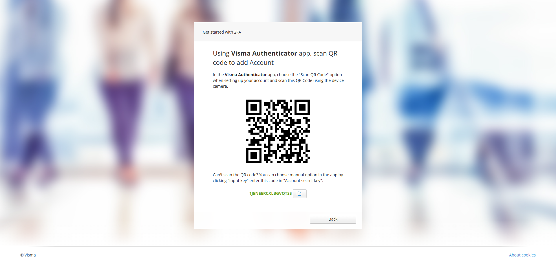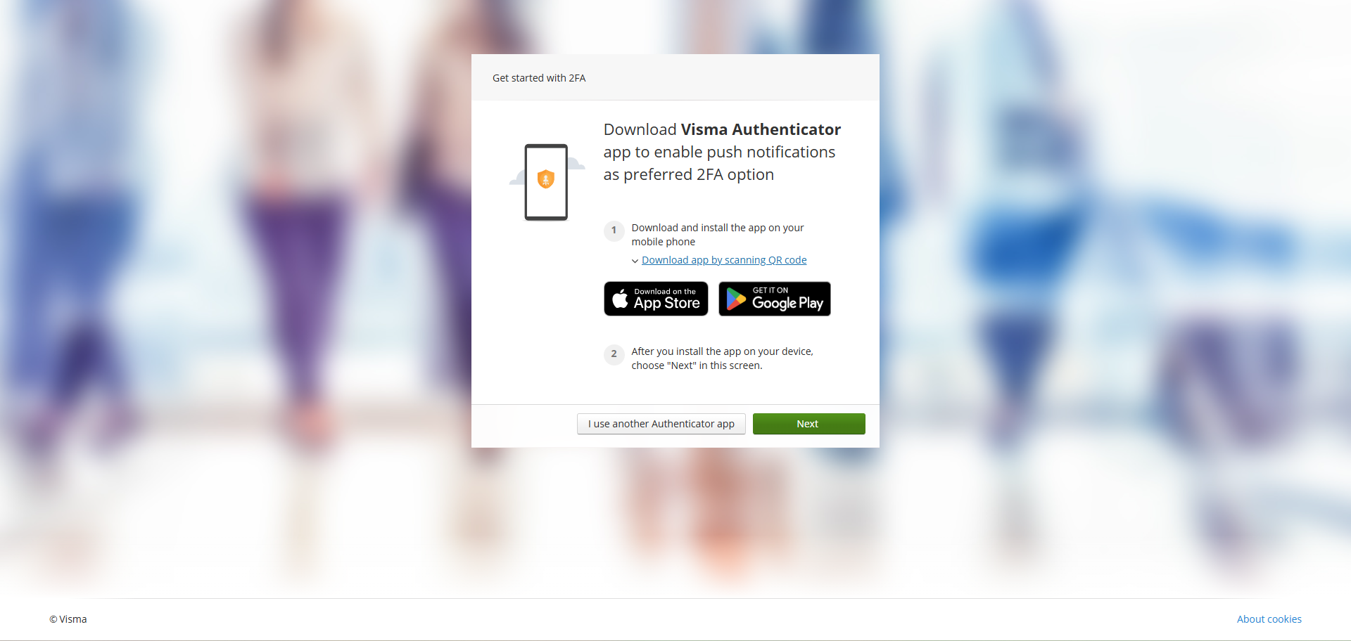 1.7. Voit ladata seuraavasta näkymästä Visma Authenticator sovelluksen painamalla app store tai google play painiketta, riippuen käyttämästäsi laitteesta. Voit myös käyttää toista autentikaattoria valitsemalla "I use another authenticator app"